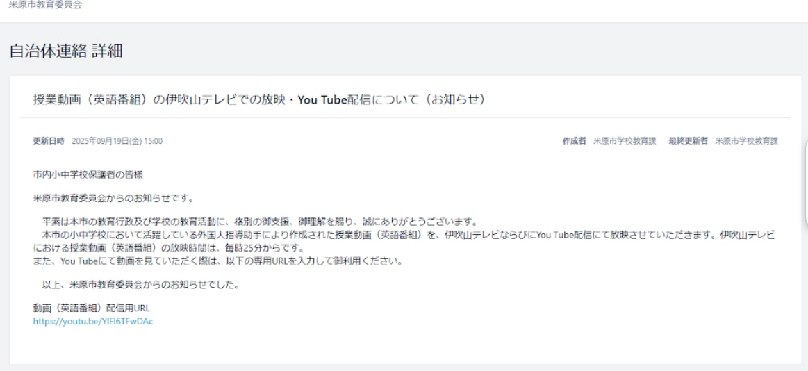 最近では、米原市が力を入れている英語教育でも活用しています。市内小中学校において活躍している外国人指導助手により作成された学習動画(英語番組)を、伊吹山テレビならびにyoutube配信にて放映していることや、そのURLをtetoru「自治体連絡」で案内しています。